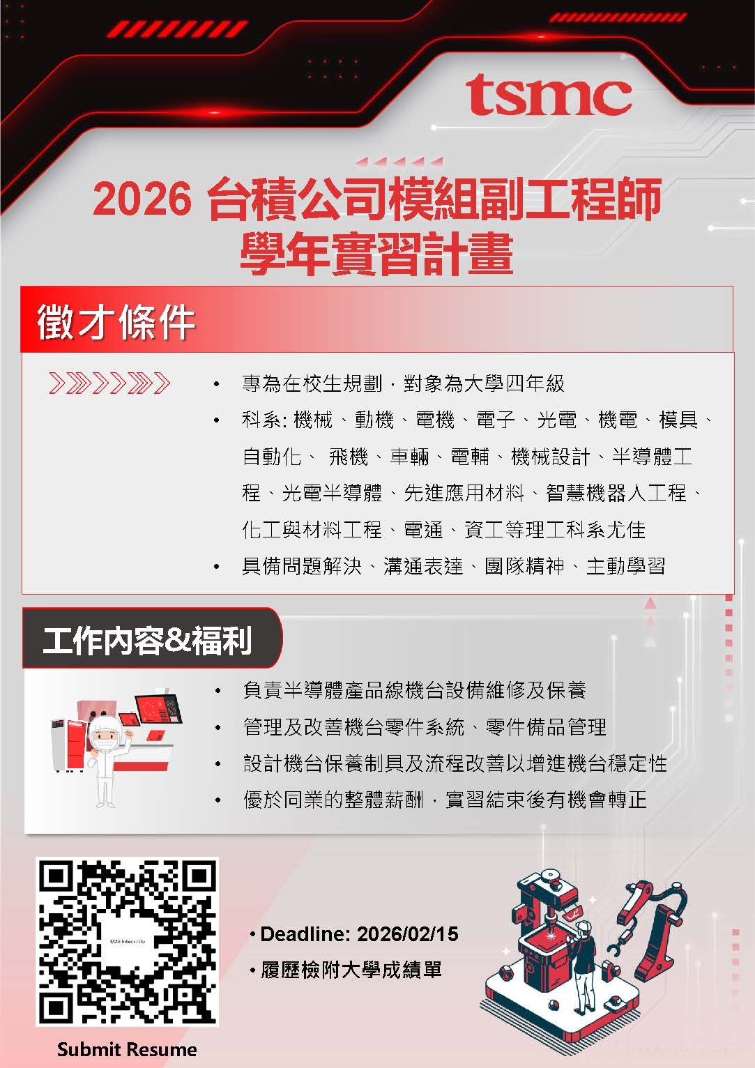 投遞履歷連結: https://bit.ly/tsmcmae2026_info